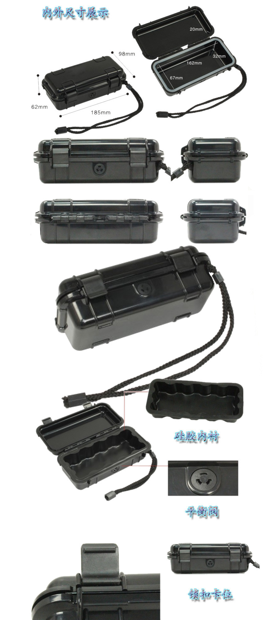 簡(jiǎn)要說(shuō)明:廣泛用于傳媒、公安、消防、軍隊(duì)、航空、戶外攝影、野外考察、科學(xué)探測(cè)等眾多領(lǐng)域的高端儀器、儀表。具有高強(qiáng)度、高抗壓沖擊、防潮、絕對(duì)密封、防塵、防水等特點(diǎn)。產(chǎn)品材質(zhì):ABS原料,箱體采用高抗沖擊的高分子聚合材料一體注塑成型,密封采用扁型彈性發(fā)泡密封橡膠條,確保防水氣密,所有較軸均采用不銹鋼材質(zhì)。