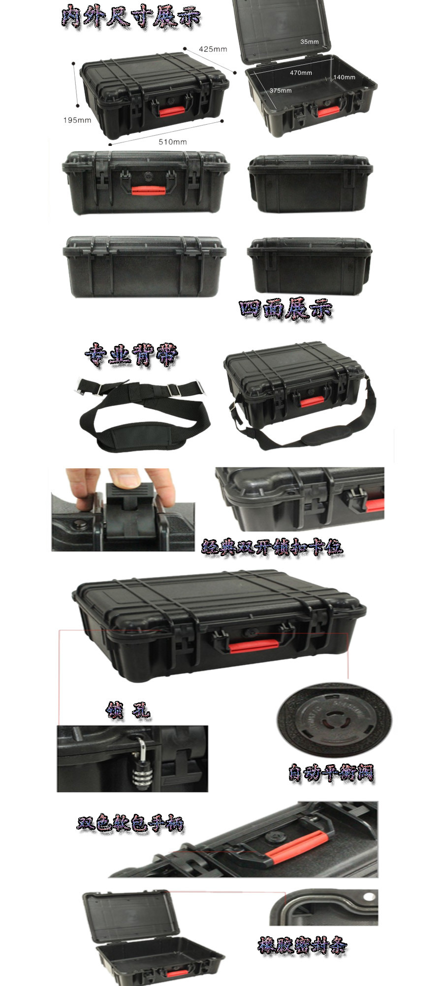 簡(jiǎn)要說(shuō)明:廣泛用于傳媒、公安、消防、軍隊(duì)、航空、戶外攝影、野外考察、科學(xué)探測(cè)等眾多領(lǐng)域的高端儀器、儀表。具有高強(qiáng)度、高抗壓沖擊、防潮、絕對(duì)密封、防塵、防水等特點(diǎn)。產(chǎn)品材質(zhì):ABS原料,箱體采用高抗沖擊的高分子聚合材料一體注塑成型,密封采用扁型彈性發(fā)泡密封橡膠條,確保防水氣密,所有較軸均采用不銹鋼材質(zhì)。